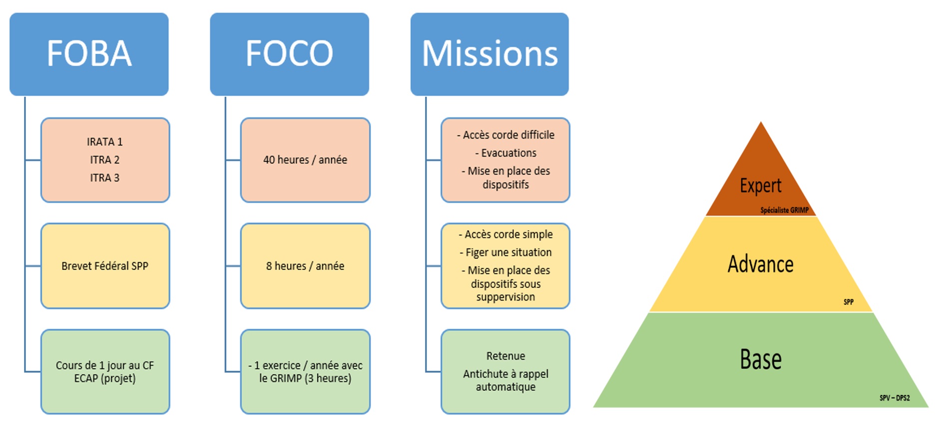 - Répondre à une mission qui demande un accès corde simple pour sécuriser une situation avant l’arrivée des spécialistes GRIMP (niveau Expert) et appuyer ceux-ci dans la mise en place des éléments sécuritaires sur les missions feu et éléments naturels avec risque de chute.